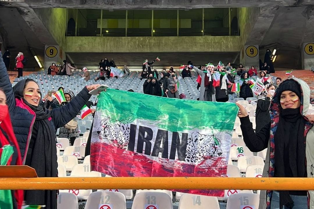 در دیدار تیمهای فوتبال ایران و عراق تعدادی از بانوان در ورزشگاه آزادی حضور دارند و این دیدار را از نزدیك تماشا میكنند.